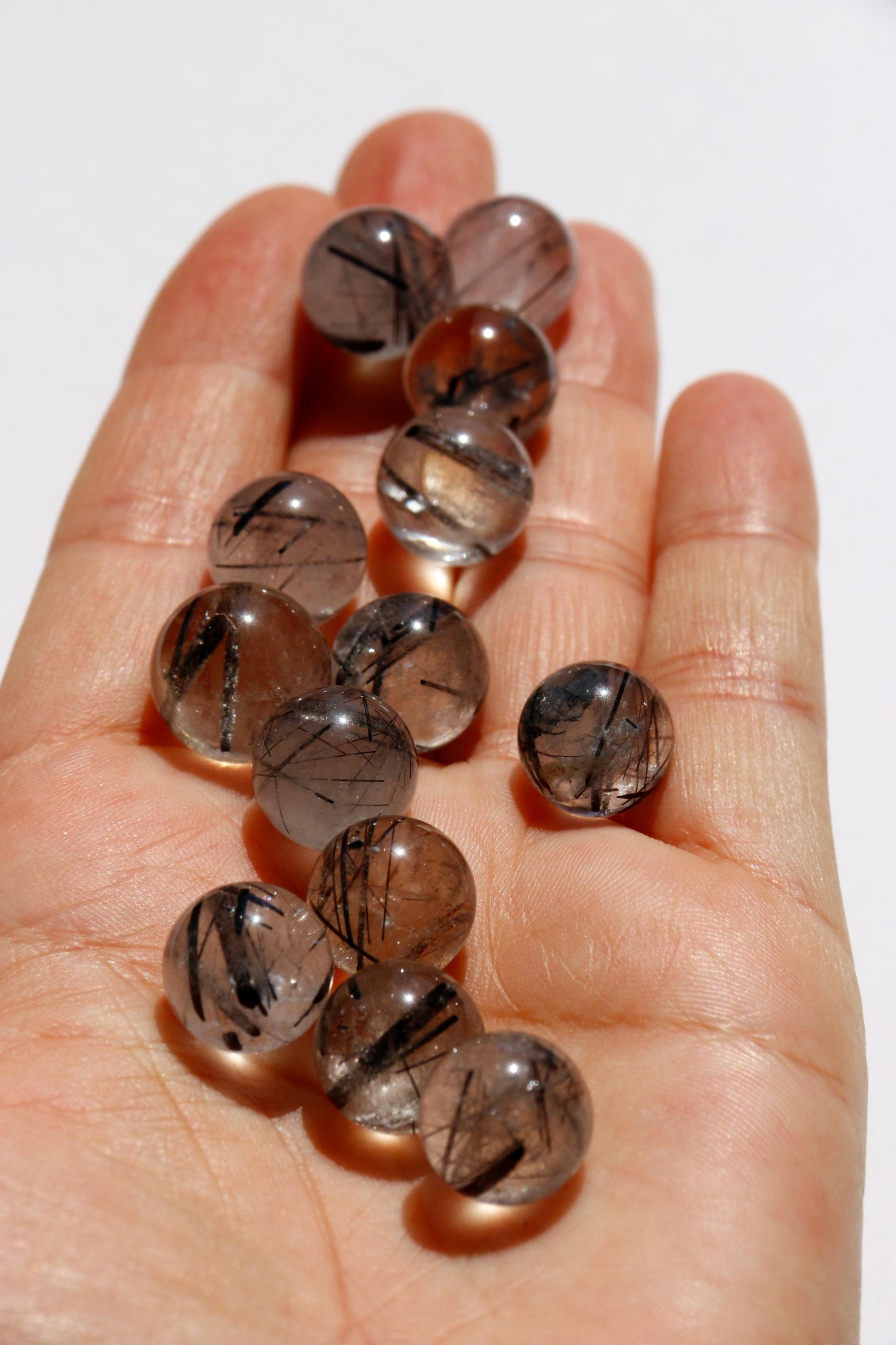 Chaque bille en quartz tourmaliné est un petit monde en soi : la transparence du quartz laisse apparaître de superbes inclusions noires de tourmaline, comme figées dans le temps. Un mélange de pureté et de puissance pour les amateurs de minéraux uniques.