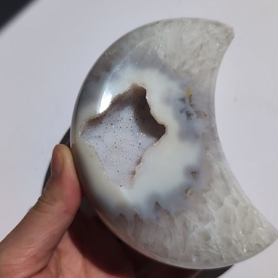 Chaque lune est une pièce unique, façonnée par la nature et révélée par la cristallisation de l’agate, offrant des nuances subtiles et des druses scintillantes à la surface.