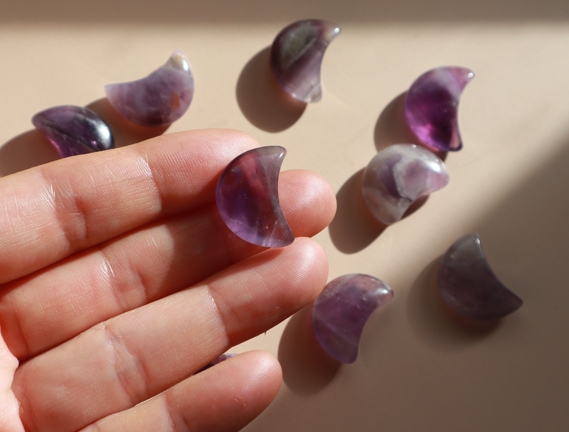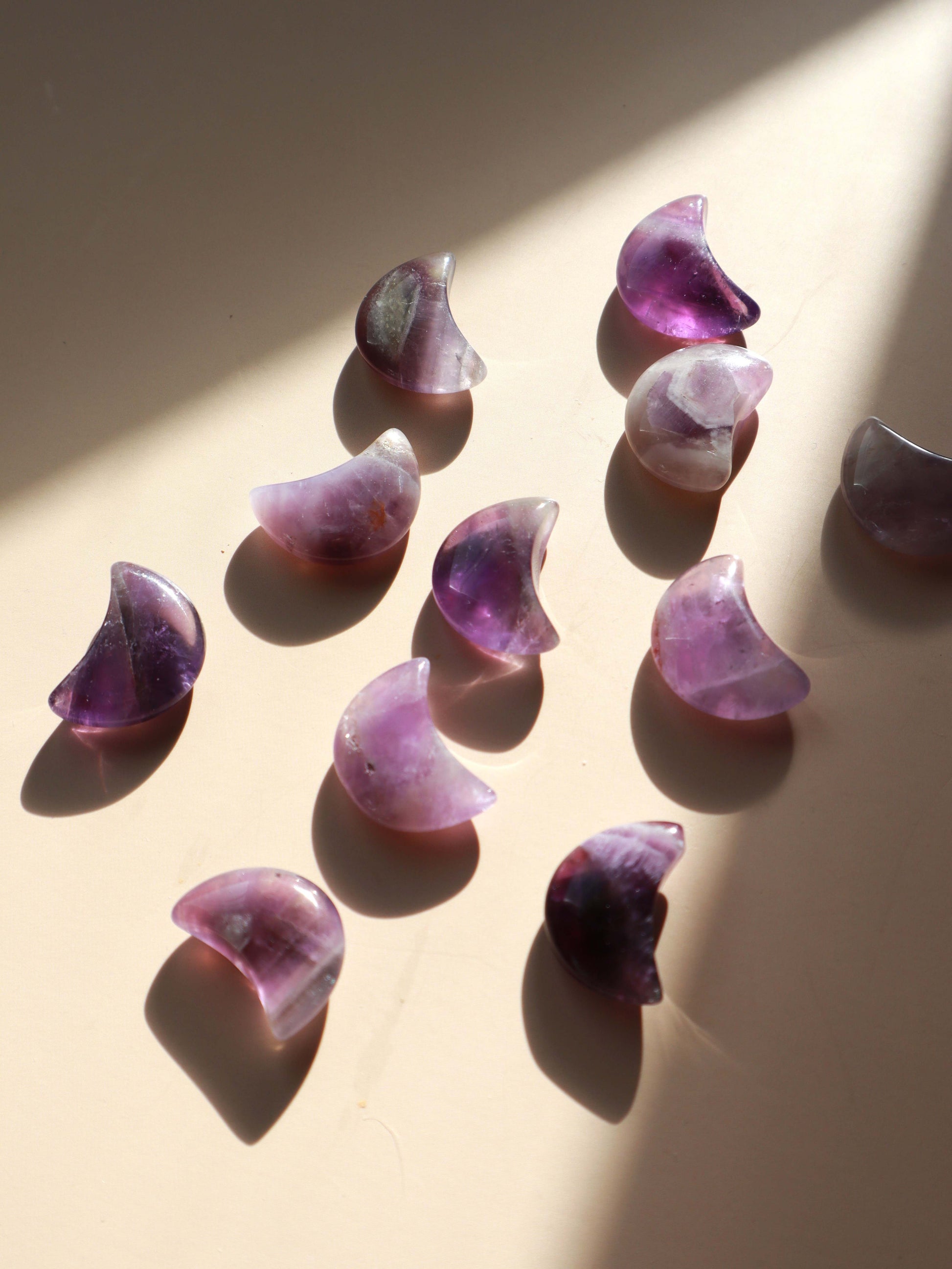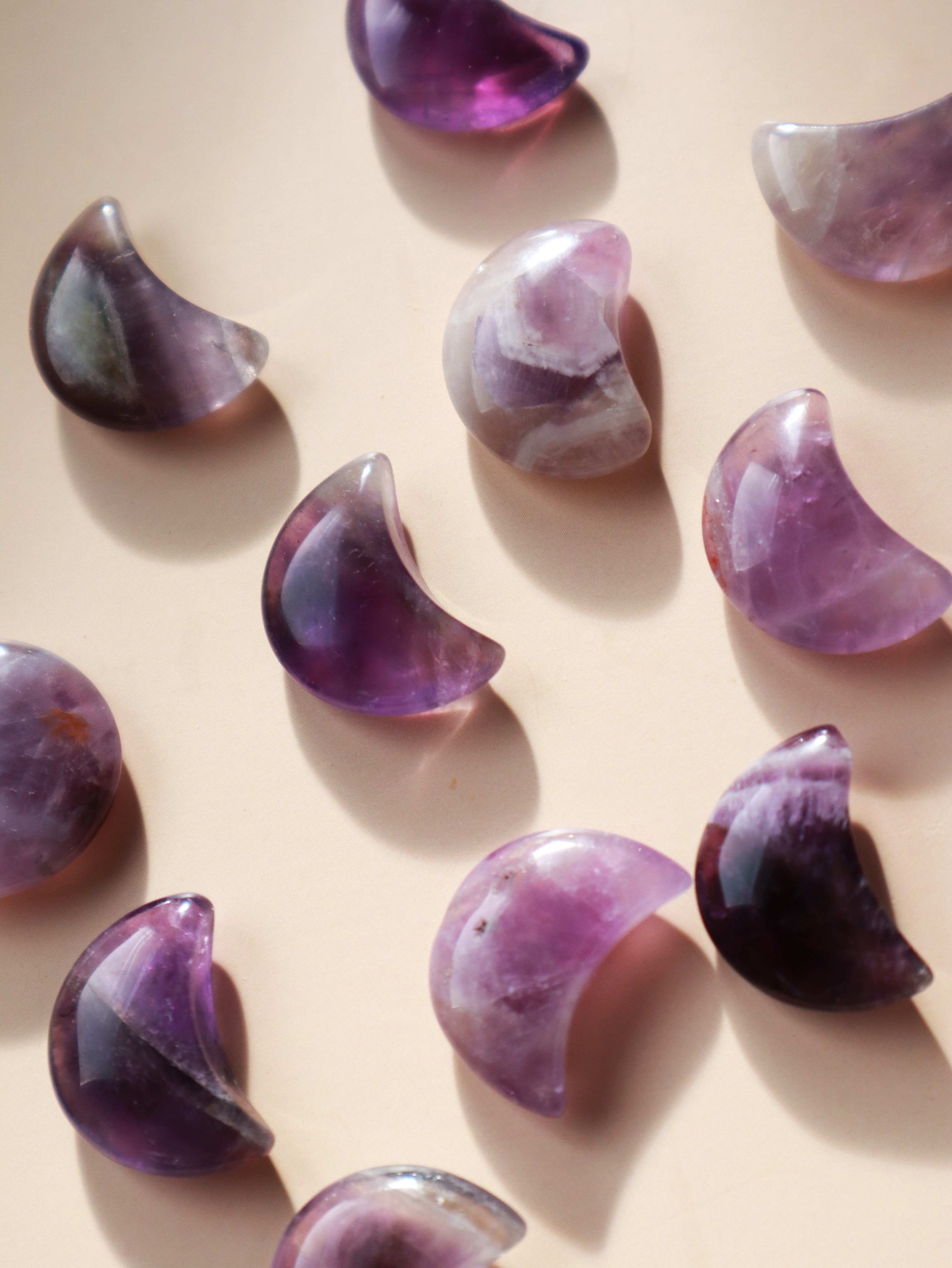 Magnifiques petites lunes sculptées en améthyste naturelle, symboles de féminité et de connexion aux cycles lunaires. Chaque pièce est unique avec ses nuances violettes caractéristiques et ses inclusions naturelles.