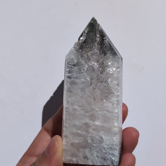 Découvrez la pointe n°316, une merveille naturelle façonnée par le temps. Cette agate cristallisée du Brésil dévoile un cœur orné de druses scintillantes, dans des nuances douces et lumineuses. Une pièce aussi décorative qu’énergétique, à exposer fièrement dans votre espace.